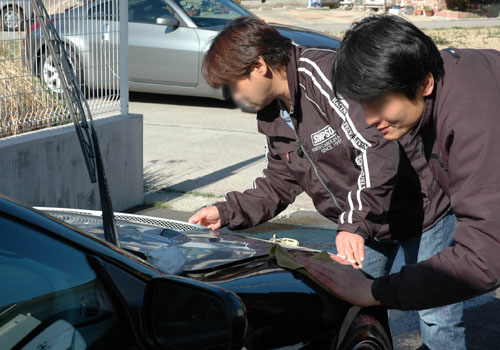 仲間のクルマを一生懸命洗車するmitsuz32さんとじけさん!ヤサシ〜