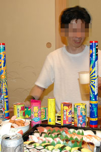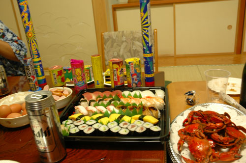 と言うわけで、御もてなしの準備は整いました!寿司、カニ、お酒、花火!いらっしゃいませ〜ガイさん! ![]()