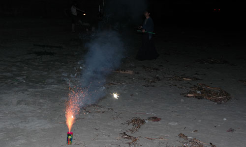 後にこの刀が大きな笑いを生むことは誰もが予想できませんでした。宴会は一旦お休み、一向は花火をするため海へ!