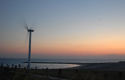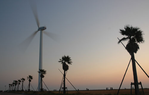 ↑椰子の木と比べるとやっぱり大きい風力発電の風車。今年は雲が少ないぞ! |